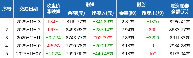 融资方面,当日融资买入492.81万元,融资偿还834.67万元,融资净偿还341.86万元。融券方面,融券卖出100股,融券偿还1400股,融券余量2.81万股,融券余额169.64万元。融资融券余额合计8286.41万元。