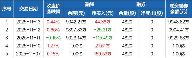 融资方面,当日融资买入543.49万元,融资偿还499.11万元,融资净买入44.38万元。融券方面,融券卖出0股,融券偿还0股,融券余量4820股,融券余额6.61万元。融资融券余额合计9948.82万元。
