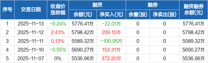 融资方面,当日融资买入814.86万元,融资偿还836.87万元,融资净偿还22.01万元。融券方面,融券卖出0股,融券偿还0股,融券余量0股,融券余额0元。融资融券余额合计5776.41万元。