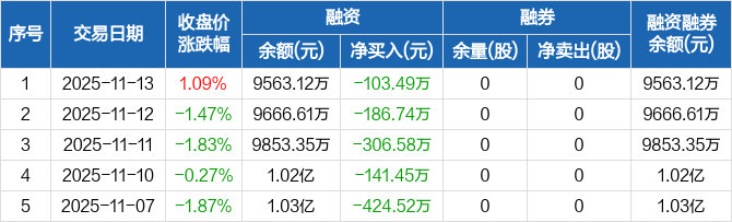 融资方面,当日融资买入306.25万元,融资偿还409.74万元,融资净偿还103.49万元,连续5日净偿还累计1162.78万元。融券方面,融券卖出0股,融券偿还0股,融券余量0股,融券余额0元。融资融券余额合计9563.12万元。