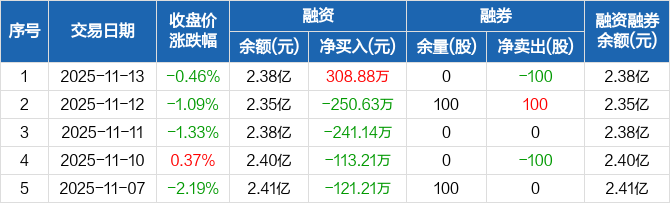 融资方面,当日融资买入980.67万元,融资偿还671.79万元,融资净买入308.88万元。融券方面,融券卖出0股,融券偿还100股,融券余量0股,融券余额0元。融资融券余额合计2.38亿元。