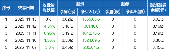 中洲特材融资融券信息显示,2025年11月13日融资净偿还1365.63万元;融资余额3.02亿元,较前一日下降4.33%。