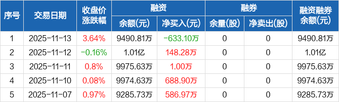 南王科技:融资净偿还633.1万元,融资余额9490.81万元(11-13)