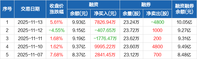 融资方面,当日融资买入2.8亿元,融资偿还2.01亿元,融资净买入7826.94万元。融券方面,融券卖出3500股,融券偿还8300股,融券余量23.24万股,融券余额1194.74万元。融资融券余额合计10.05亿元。