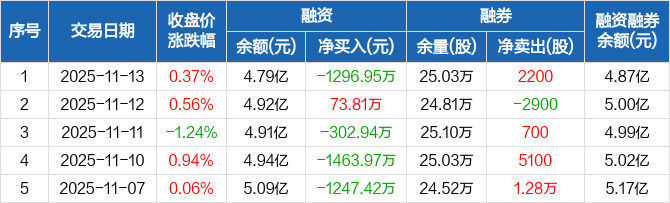融资方面,当日融资买入2513.47万元,融资偿还3810.42万元,融资净偿还1296.95万元。融券方面,融券卖出3100股,融券偿还900股,融券余量25.03万股,融券余额807.09万元。融资融券余额合计4.87亿元。