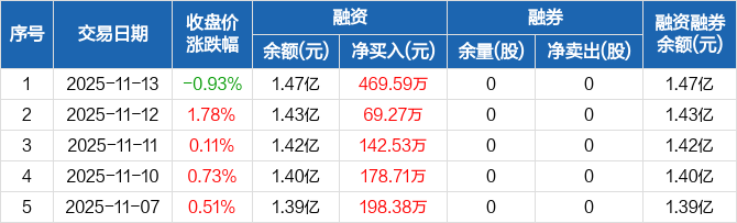 融资方面,当日融资买入1331.72万元,融资偿还862.13万元,融资净买入469.59万元,连续5日净买入累计1058.48万元。融券方面,融券卖出0股,融券偿还0股,融券余量0股,融券余额0元。融资融券余额合计1.47亿元。