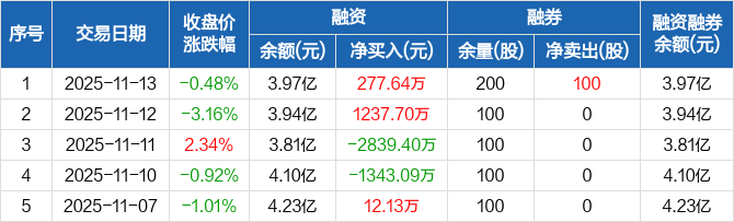 融资方面,当日融资买入4257.79万元,融资偿还3980.15万元,融资净买入277.64万元。融券方面,融券卖出100股,融券偿还0股,融券余量200股,融券余额1.95万元。融资融券余额合计3.97亿元。