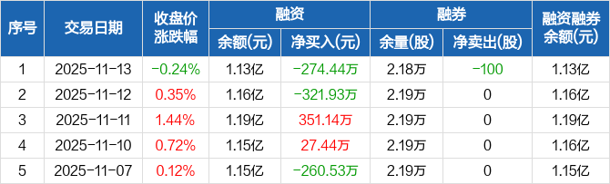 融资方面,当日融资买入455.66万元,融资偿还730.1万元,融资净偿还274.44万元。融券方面,融券卖出0股,融券偿还100股,融券余量2.18万股,融券余额18.49万元。融资融券余额合计1.13亿元。