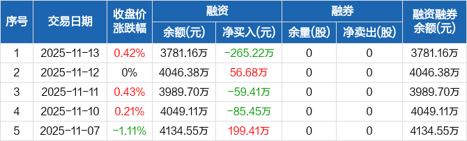 中荣股份:融资净偿还265.22万元,融资余额3781.16万元(11-13)