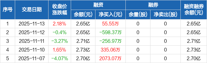 融资方面,当日融资买入1888.21万元,融资偿还1832.66万元,融资净买入55.55万元。融券方面,融券卖出0股,融券偿还0股,融券余量0股,融券余额0元。融资融券余额合计2.65亿元。