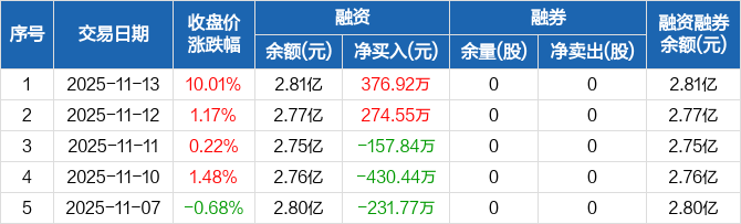 融资方面,当日融资买入5845.83万元,融资偿还5468.91万元,融资净买入376.92万元。融券方面,融券卖出0股,融券偿还0股,融券余量0股,融券余额0元。融资融券余额合计2.81亿元。