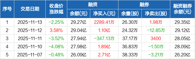 蓝思科技融资融券信息显示,2025年11月13日融资净买入2289.41万元;融资余额29.27亿元,创近一年新高,较前一日增加0.79%。