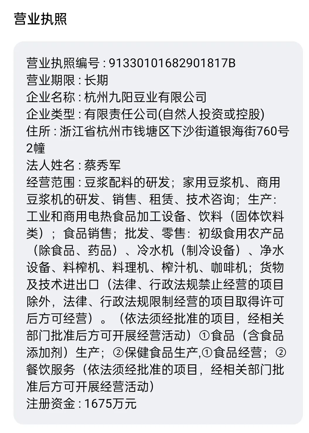从店铺资质证照看到,企业名称为杭州九阳豆业有限公司,注册资金1675万元,法人姓名为蔡秀军。