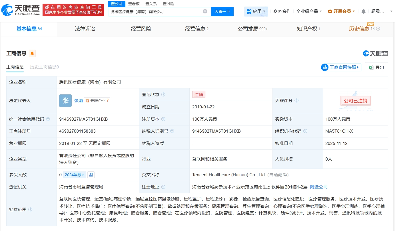 南方财经11月14日电,天眼查工商信息显示,近日,腾讯医疗健康(海南)有限公司登记状态由存续变更为注销。该公司成立于2019年1月,法定代表人为张渝,注册资本100万人民币,经营范围包括互联网医院管理、运营,在医疗领域内投资,健康管理咨询等。股东信息显示,该公司由腾讯医疗健康(深圳)有限公司全资持股。