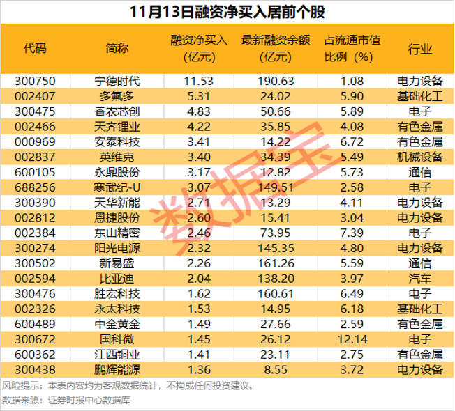 具体到个股,11月13日获融资净买入1亿元以上的有38只,其中,8只融资净买入额均超3亿元。