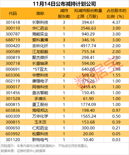 11月14日,21家公司发布了减持计划。长联科技、华仁药业、海能实业等拟减持比例居前。