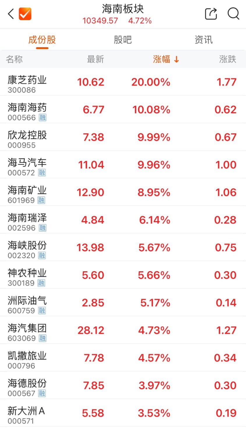 11月14日,海南板块快速走强,海马汽车走出11天7板,康芝药业(300086)“20cm”涨停,海南海药、欣龙控股“10cm”涨停,洲际油气、海南瑞泽、海南矿业等跟涨。