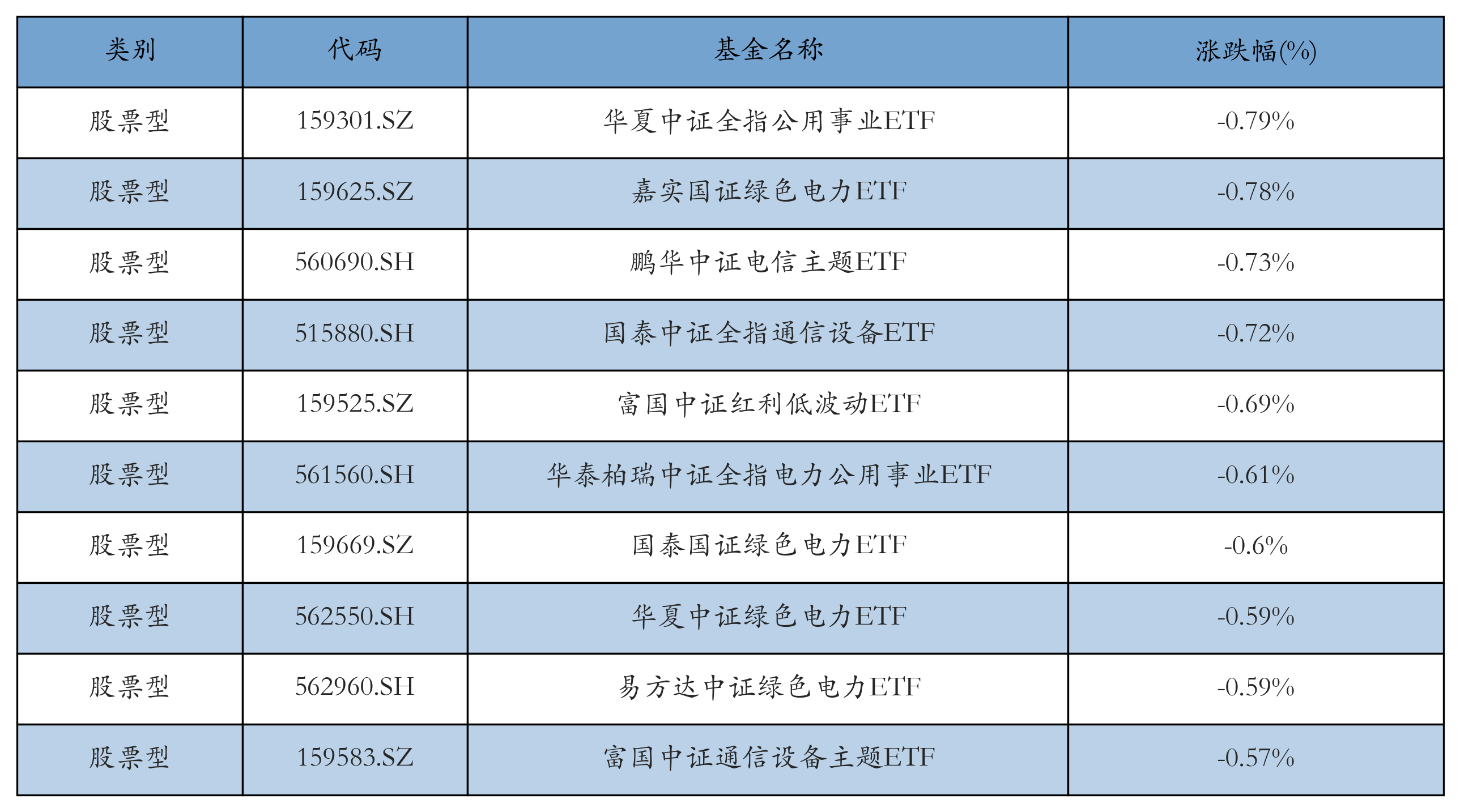 昨日股票型ETF跌幅最大的3只ETF及其收益率分别为:华夏中证全指公用事业ETF(-0.79%)、嘉实国证绿色电力ETF(-0.78%)、鹏华中证电信主题ETF(-0.73%)。跌幅前10详情见下表: