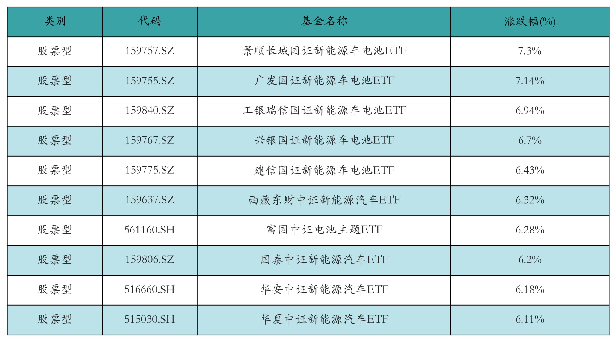 昨日股票型ETF涨幅最高的3只ETF及其收益率分别为:景顺长城国证新能源车电池ETF(7.3%)、广发国证新能源车电池ETF(7.14%)、工银瑞信国证新能源车电池ETF(6.94%)。涨幅前10详情见下表: