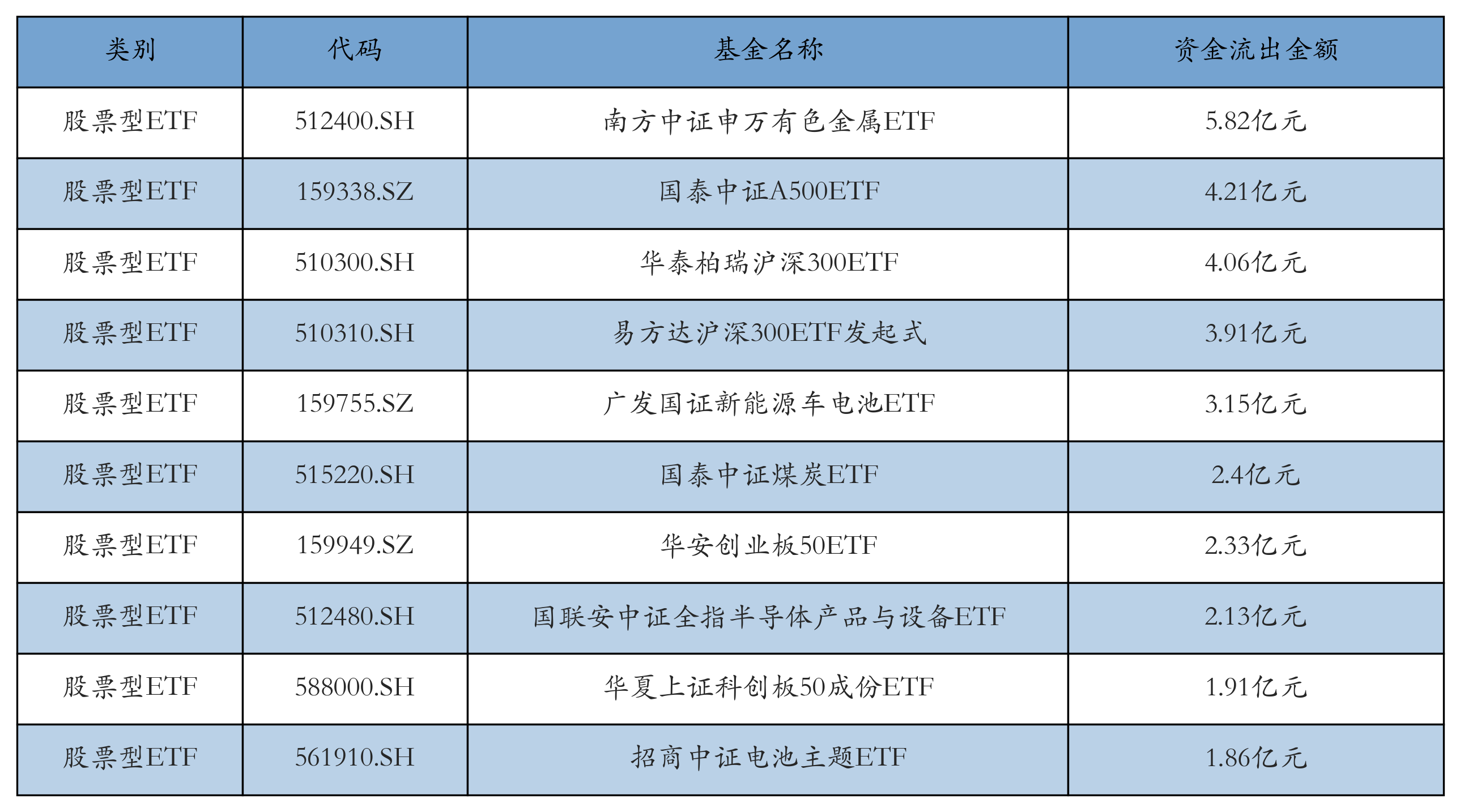 昨日股票型ETF资金流出最多的3只ETF及其流出金额分别为:南方中证申万有色金属ETF(流出5.82亿元)、国泰中证A500ETF(流出4.21亿元)、华泰柏瑞沪深300ETF(流出4.06亿元)。资金流出前10详情见下表: