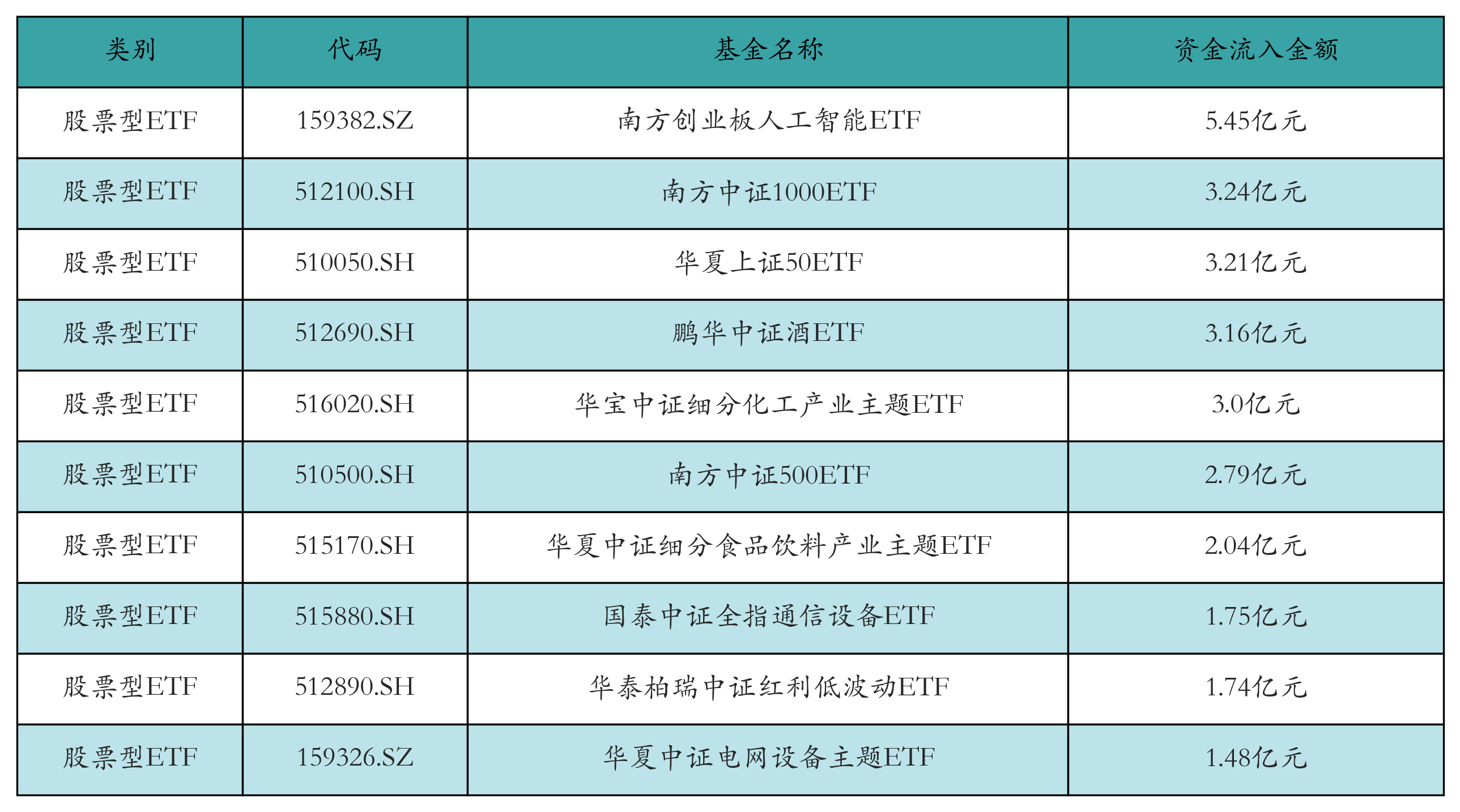 昨日股票型ETF资金流入最多的3只ETF及其流入金额分别为:南方创业板人工智能ETF(流入5.45亿元)、南方中证1000ETF(流入3.24亿元)、华夏上证50ETF(流入3.21亿元)。资金流入前10详情见下表: