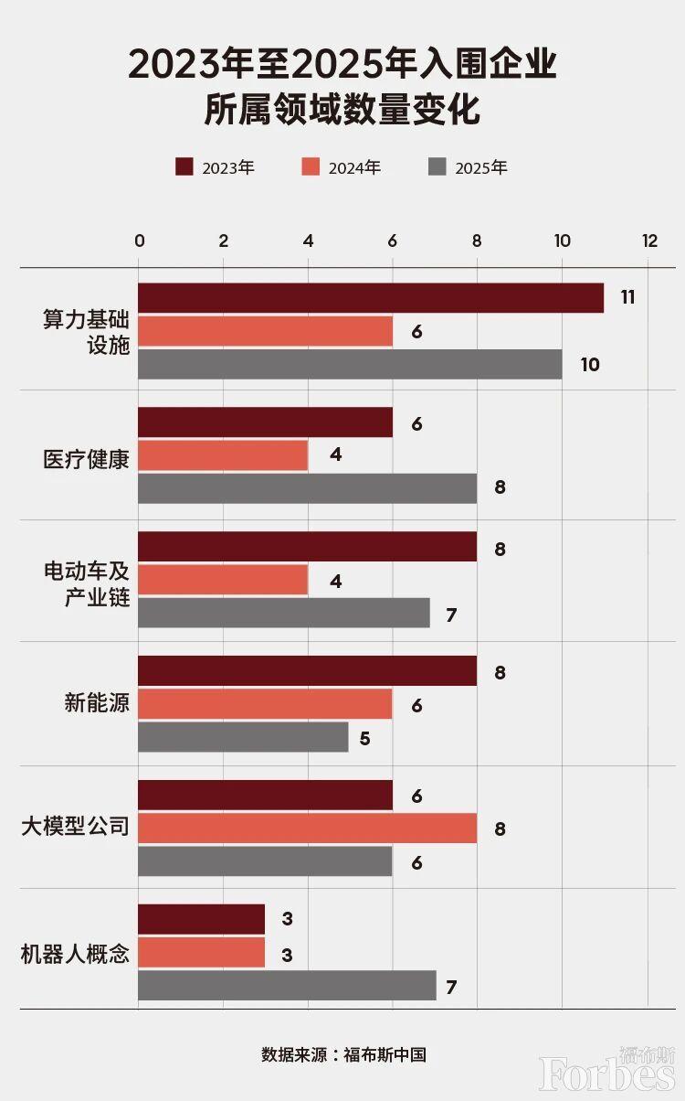 今年一共有13家创业公司入选福布斯中国创新力企业50强。与去年相比,这一数字小幅回落。但在一些领域,创业公司的成长势头仍然强劲。如在商业航天领域,2025年9月,星际荣耀完成了D+轮融资首批7亿元人民币的交割。公司称,截至目前,已完成所有产品齐套交付并开始总装,将全力冲刺首次“入轨+海上回收”飞行试验。