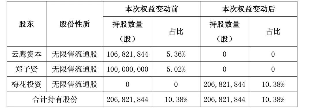 本次权益变动后,梅花投资持有公司2.07亿股股份,占公司总股本的10.38%,将成为公司持股5%以上股东。云鹰资本、郑子贤将不再持有公司股份。