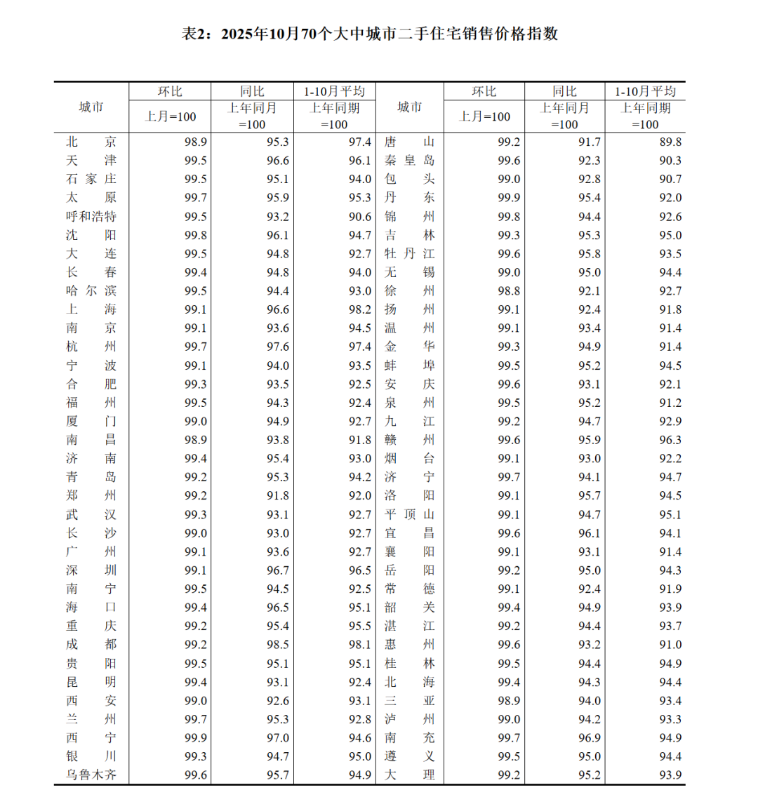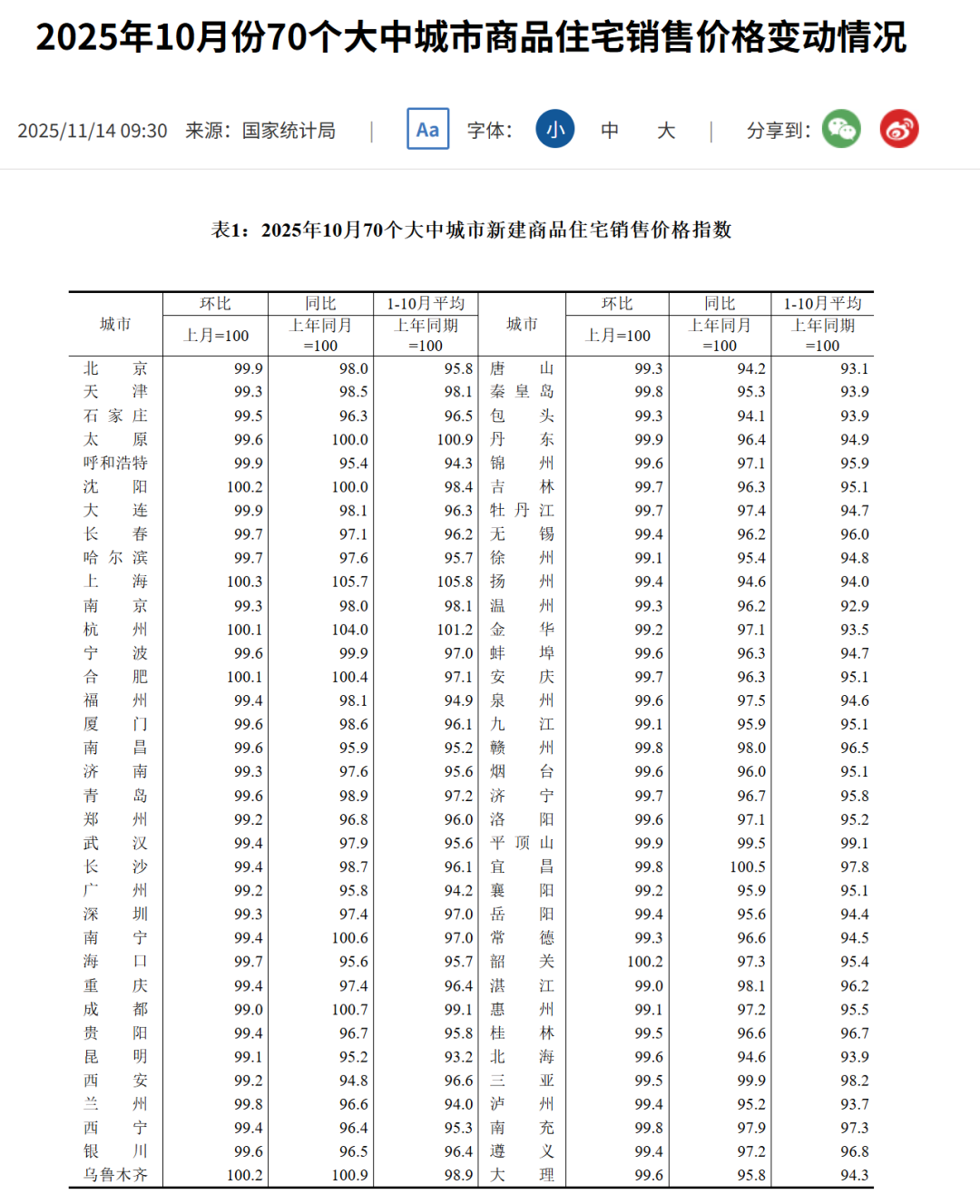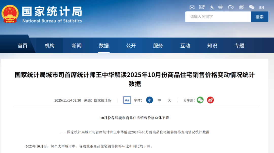 11月14日,国家统计局公布2025年10月份商品住宅销售价格变动情况统计数据。2025年10月份,70个大中城市中,各线城市商品住宅销售价格环比和同比均下降。