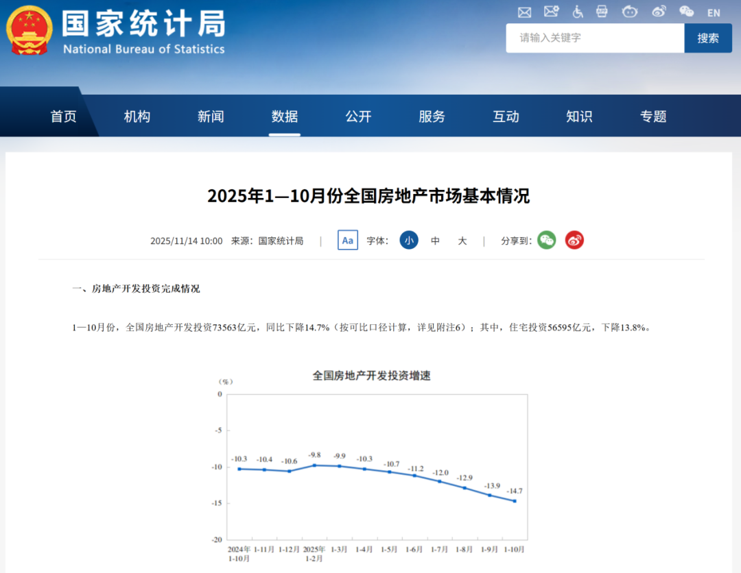 数据显示,1—10月份,全国房地产开发投资73563亿元,同比下降14.7%(按可比口径计算);其中,住宅投资56595亿元,下降13.8%。
