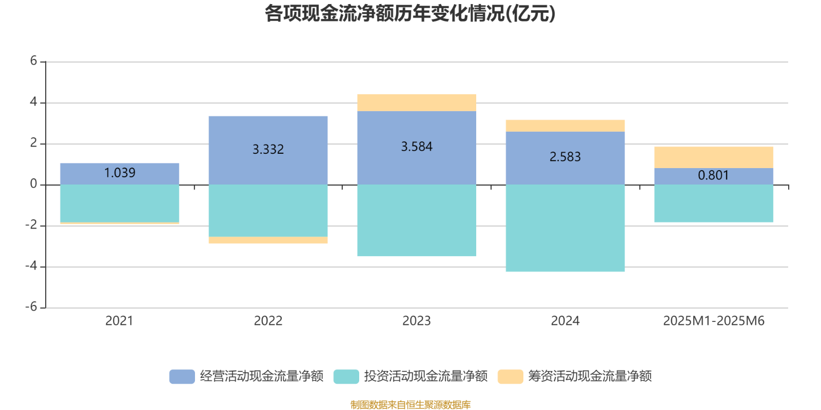 2025年1月至6月,公司经营活动现金流净额为8012.9万元,同比下降52.05%;筹资活动现金流净额1.04亿元,同比增加5077.8万元;投资活动现金流净额-1.84亿元,上年同期为-2.84亿元。