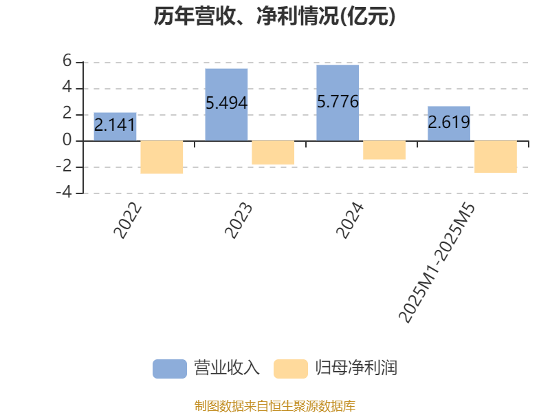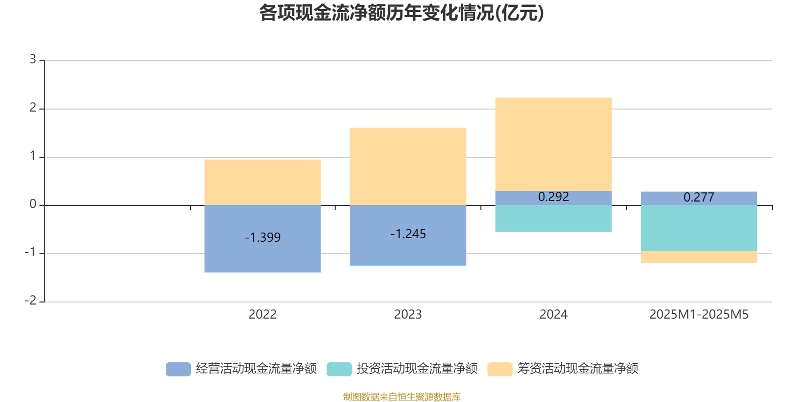 2025年1月至5月,公司经营活动现金流净额为2767.2万元,同比增长184.69%;筹资活动现金流净额-2416.5万元,同比减少4389.8万元;投资活动现金流净额-9552.2万元,上年同期为-2338.7万元。