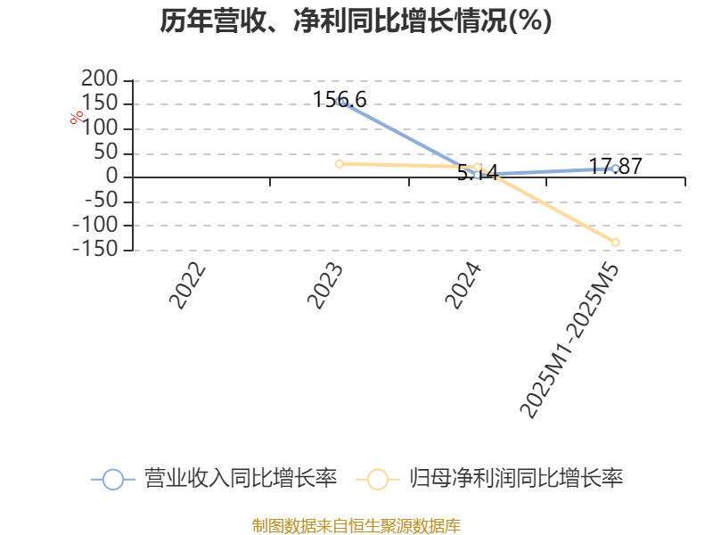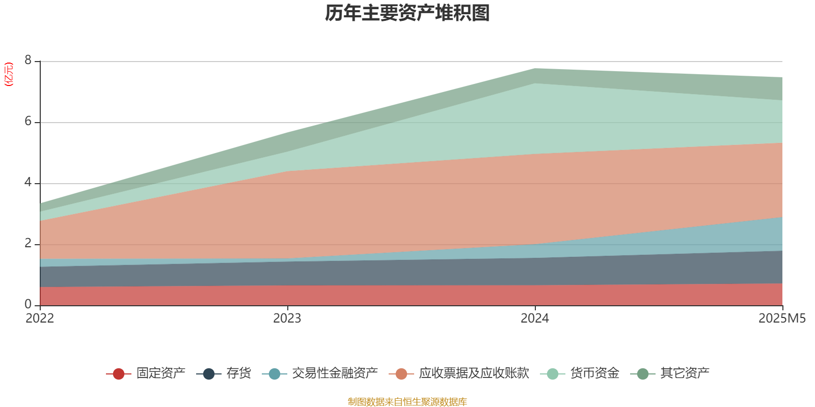 资产重大变化方面,截至2025年5月,公司货币资金较上期末减少39.96%,占公司总资产比重下降11.21个百分点;交易性金融资产较上期末增加144.2%,占公司总资产比重上升8.93个百分点;应收票据及应收账款较上期末减少17.58%,占公司总资产比重下降5.46个百分点;存货较上期末增加20.06%,占公司总资产比重上升2.85个百分点。