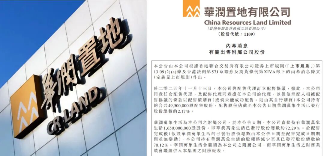 11月13日,华润置地公告,拟配售手中4950万股华润万象生活的股份,套现20.6亿港元。