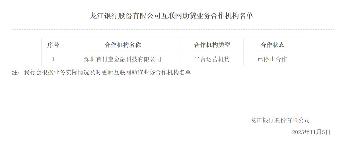 11月5日,龙江银行虽按新规要求公布了合作机构名单,但名单中唯一的助贷机构的状态标注为“已停止合作”。