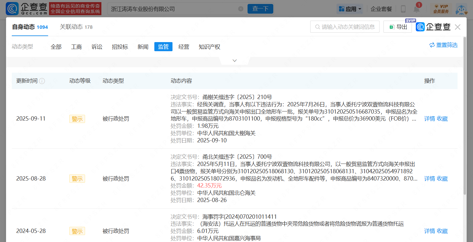 宁波海关在2025年8月的处罚决定书中指明,公司申报出口的4票货物实际可组装为2000辆全地形车,存在品名及商品编号申报不实情形,被罚42.35万元。随后,宁波海关又因一批全地形车规格申报偏差,对公司处以1.98万元罚款。