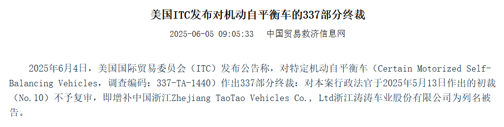 与高速增长同步的,是合规风险的持续暴露。最受关注的是美国国际贸易委员会(ITC)于2025年对“特定机动自平衡车”发起的337调查(337-TA-1440)。涛涛车业虽未在最初名单中,但申诉人随后追加其为被告,ITC裁定同意增补。调查仍在推进,结果尚未可知。