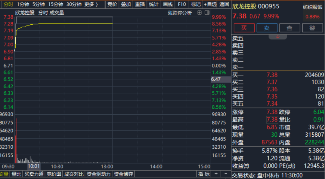 开盘1分钟,欣龙控股就被直线拉升至涨停,海南海药也在5分钟内封死涨停板;随后,海马汽车、海南矿业、康芝药业等陆续涨停。截至14时,海南自贸板块整体涨幅高达3.8%,领涨两市。