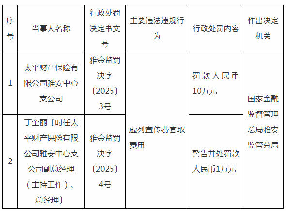 虚列宣传费套取费用,太平财险雅安中心支公司被罚款10万元