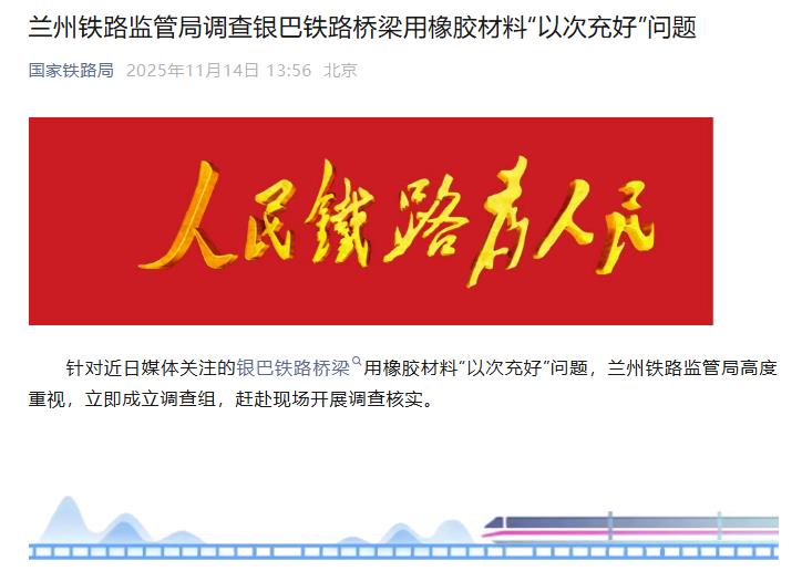 11月14日,国家铁路局发布消息称,兰州铁路监管局立即成立调查组,赶赴现场调查核实《经济参考报》此前报道的银巴铁路桥梁用橡胶材料“以次充好”问题。