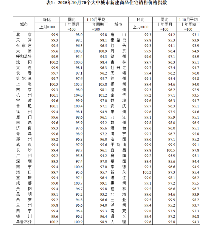 表1:2025年10月70个大中城市新建商品住宅销售价格指数