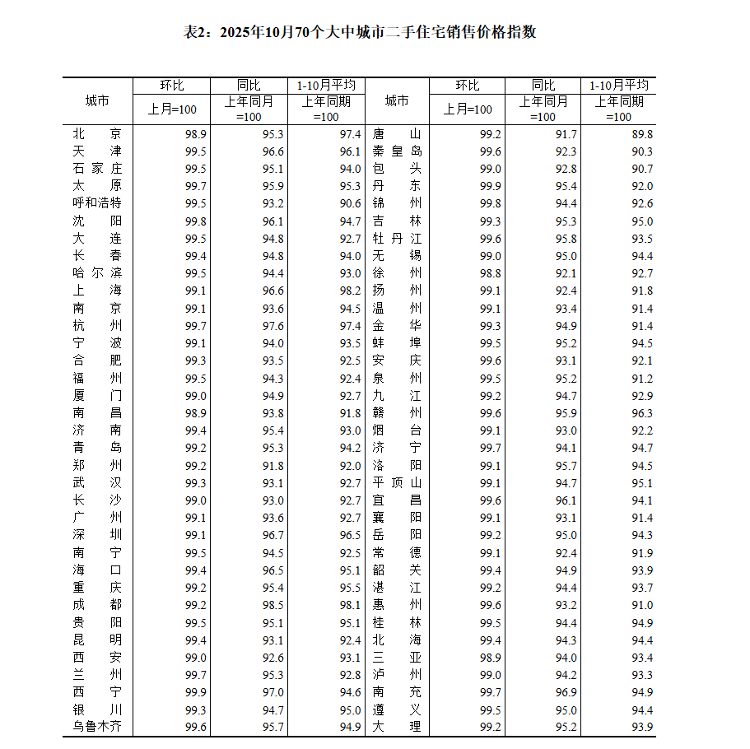 表2:2025年10月70个大中城市二手住宅销售价格指数