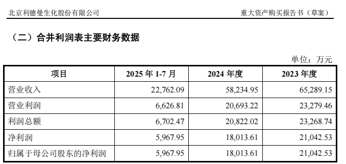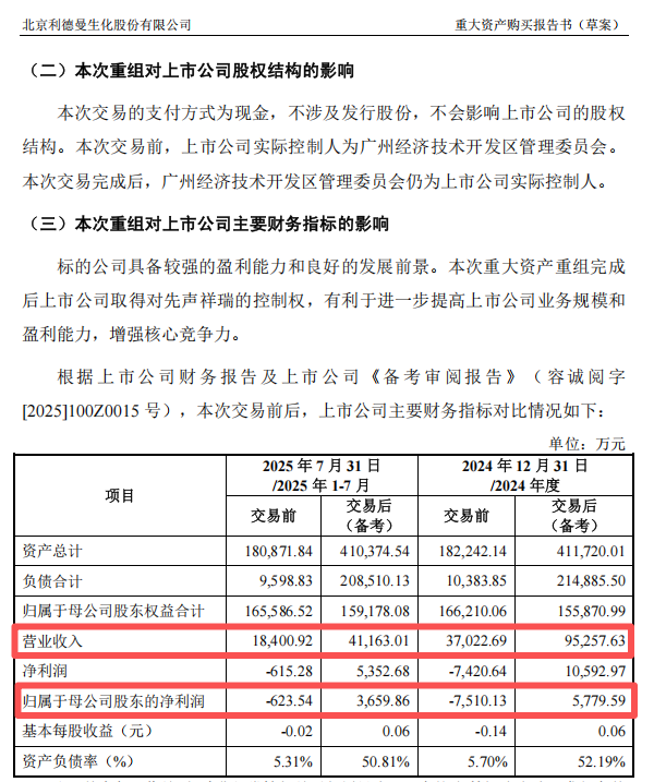根据《备考审阅报告》,本次交易前,利德曼2024年及2025年前7月的营业收入分别为3.70亿元及1.84亿元,归母净利润分别为-7510.13万元及-623.54万元;本次交易后,利德曼2024年及2025年前7月的营业收入分别为9.53亿元及4.12亿元,归母净利润分别为5779.59万元及3659.86万元。