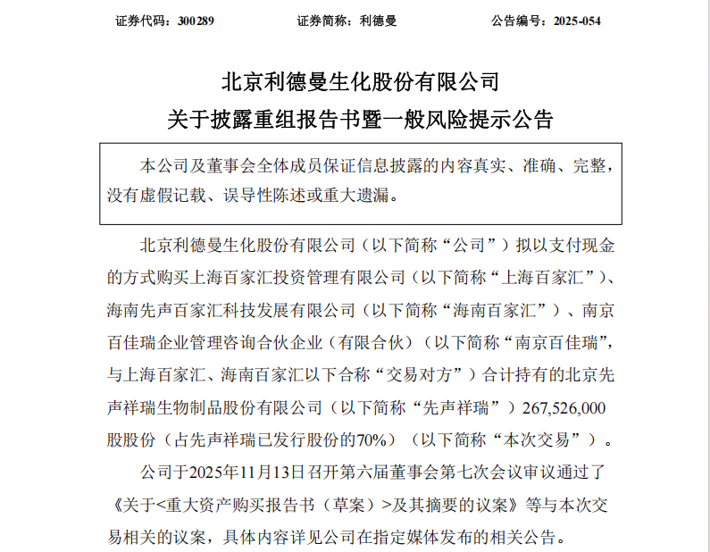 11月13日晚间,利德曼(300289)发布的《重大资产购买报告书(草案)》(简称《草案》)显示,公司拟以支付现金的方式购买北京先声祥瑞生物制品股份有限公司(简称“先声祥瑞”)70%的股份,交易价格为17.33亿元,预计构成重大资产重组。