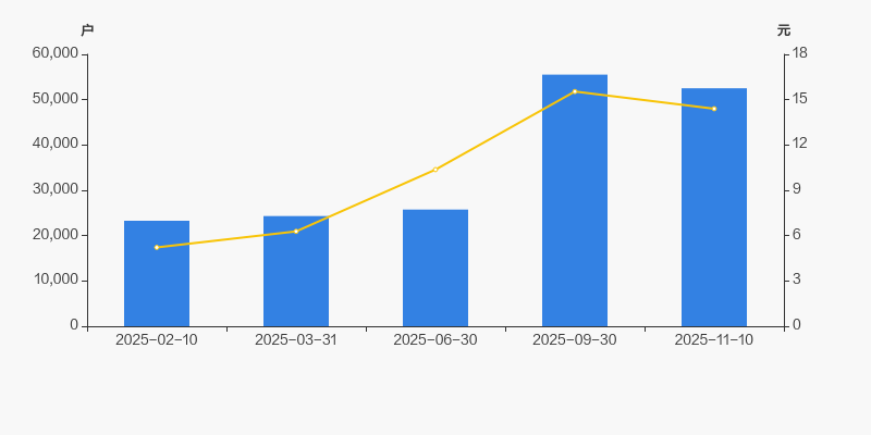 2025年2月10日至今,公司股东户数成倍增长,区间涨幅达125.60%。2025年2月10日至2025年11月10日区间股价上涨175.86%。