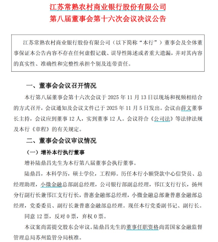 常熟银行公告显示,其董事会会议已经通过了聘任陆鼎昌为行长兼首席合规官的议案,并增补陆鼎昌为第八届董事会执行董事。