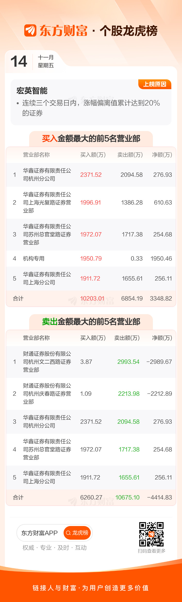 交易所2025年11月14日公布的交易公开信息显示,宏英智能因成为连续三个交易日内,涨幅偏离值累计达到20%的证券上榜。宏英智能当日收报36.27元,涨跌幅10.01%,换手率21.99%,成交额4.54亿。异常期间11月13日至11月14日,期间涨幅21.02%,累计偏离值20.87%,区间成交额6.73亿。