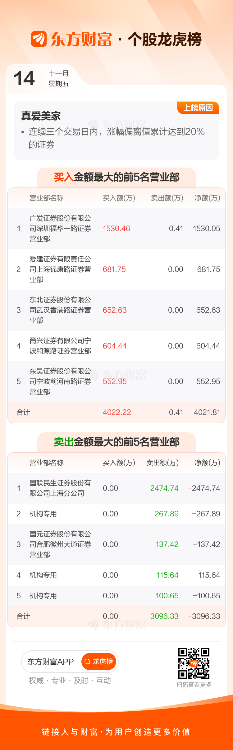 交易所2025年11月14日公布的交易公开信息显示,真爱美家因成为连续三个交易日内,涨幅偏离值累计达到20%的证券上榜。真爱美家当日收报41.02元,涨跌幅10.00%,换手率0.75%,成交额4231.02万。异常期间11月13日至11月14日,期间涨幅21.00%,累计偏离值20.85%,区间成交额4743.00万。