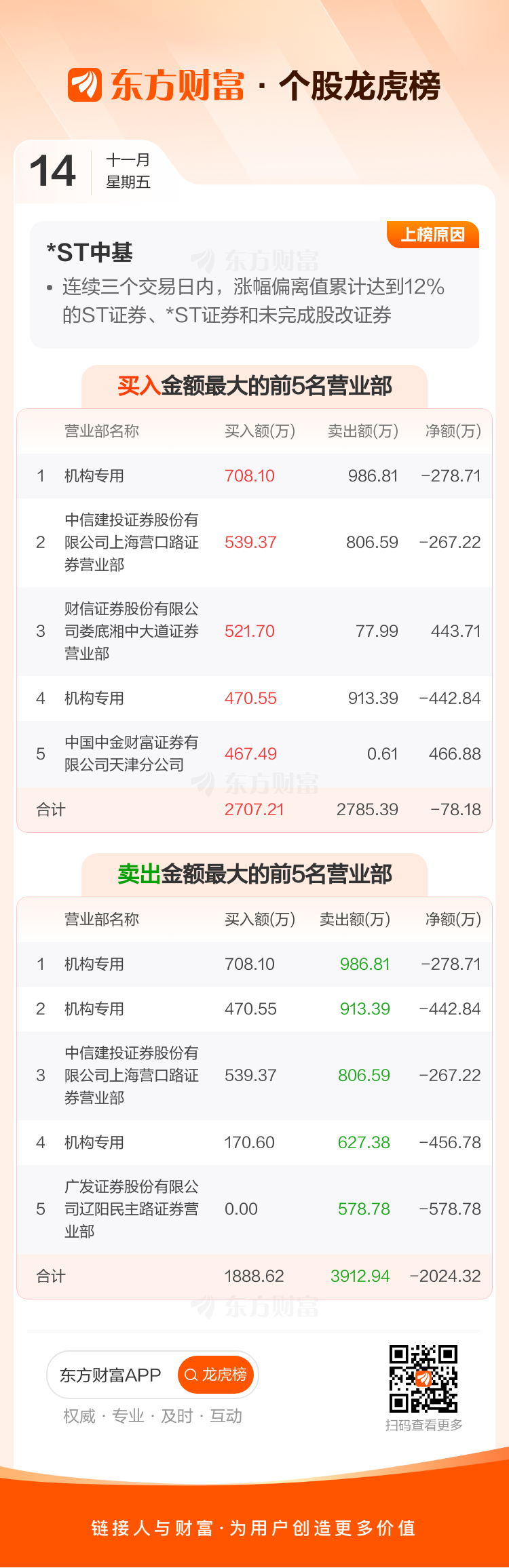 交易所2025年11月14日公布的交易公开信息显示,*ST中基因成为连续三个交易日内,涨幅偏离值累计达到12%的ST证券、*ST证券和未完成股改证券上榜。*ST中基当日收报4.25元,涨跌幅2.41%,换手率6.19%,成交额2.06亿。异常期间11月12日至11月14日,期间涨幅13.03%,累计偏离值13.27%,区间成交额3.75亿。