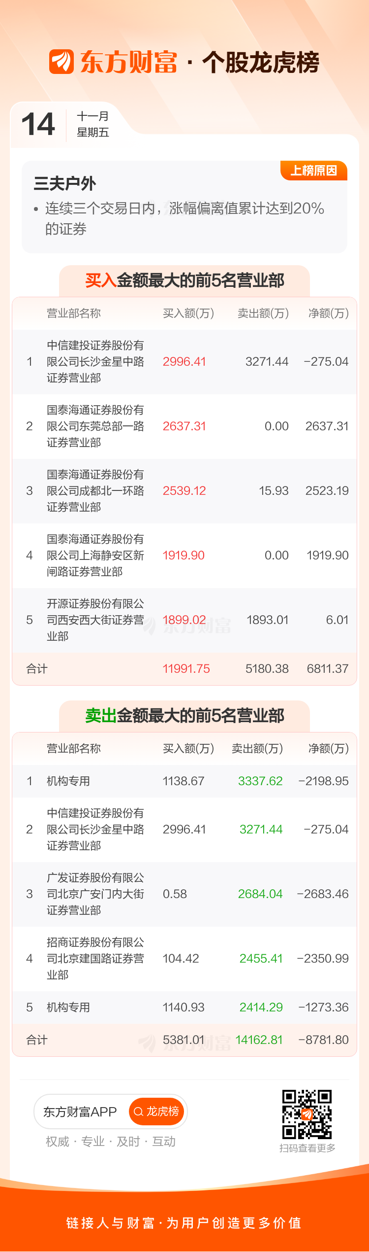 交易所2025年11月14日公布的交易公开信息显示,三夫户外因成为日换手率达到20%的前5只证券、连续三个交易日内,涨幅偏离值累计达到20%的证券上榜。三夫户外当日收报19.2元,涨跌幅10.03%,偏离值41.91%,换手率41.91%,成交额10.28亿。异常期间11月13日至11月14日,期间涨幅21.06%,累计偏离值20.91%,区间成交额15.05亿。