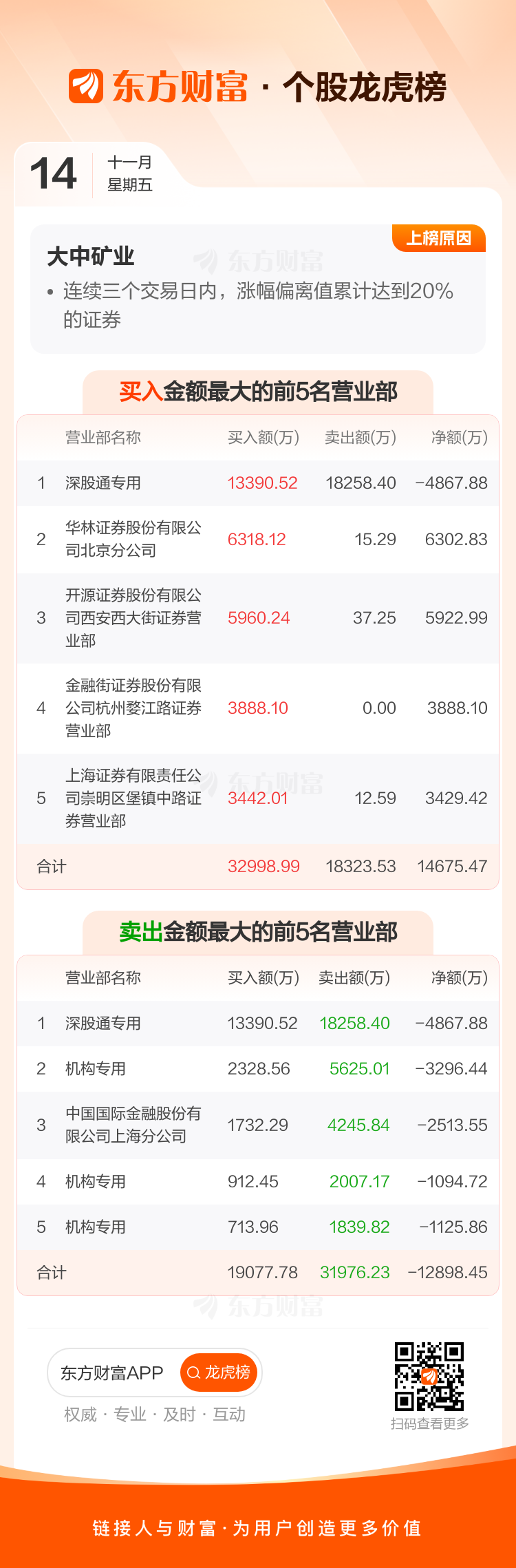 交易所2025年11月14日公布的交易公开信息显示,大中矿业因成为连续三个交易日内,涨幅偏离值累计达到20%的证券上榜。大中矿业当日收报28.08元,涨跌幅9.99%,换手率2.39%,成交额8.42亿。异常期间11月13日至11月14日,期间涨幅20.98%,累计偏离值20.83%,区间成交额18.15亿。